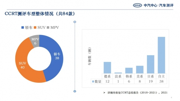 【智车派新闻】在购买新车的时候,除了配置和价格需要我们多关注,还有一些数据我们也要多参考,其中就包括中汽测评发布CCRT报告。12月30日,智车派了解到,中汽测评发布了CCRT(2018年-2021年)总结报告,报告框架分为四块,分别是车内空气质量、中国工况油耗、人体电磁防护以及消费者满意度。 ![]() 此次一共测评了84款车,40台SUV、38台轿车以及6台MPV,测评车型综合性能得分稳步提升,自主品牌趋势更加明显。