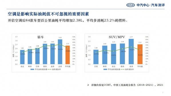 报告显示,CCRT中国工况油耗与用户实际耗油更贴近,偏差绝对值平均为6.1%。并且,数据显示车内开启空调后84款车型百公里油耗平均增加2.38L,平均多消耗23.2%的燃料,这意味着空调是影响实际油耗值不可忽视的重要因素。 此外,报告列出常温以及高温模式下各污染物的达标率,其中常温模式中,车内污染物达标率高;高温下车内污染物挥发需要引起大家的重视。另外,报告还显示了电动车、混动车以及传统车的车辆电子辐射状况,结果表明不同驱动类型车辆电磁辐射水平没有明显差异。